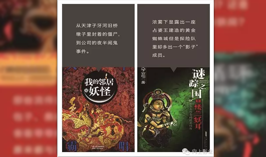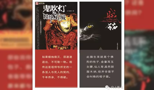 向上影业与“向上霸唱”IP孵化厂牌共同发布“2015向上计划”同步开发天下霸唱编著的《鬼吹灯之牧野诡事》、《死亡循环》、《抚仙湖下的僵尸村》、《天坑历险记》、《北大荒狼灾记》、《崔老道捉妖》、《灵异游戏》、《地底世界之雾隐占婆》、《八极拳宗师》、《凶冥十杀阵》等系列IP。