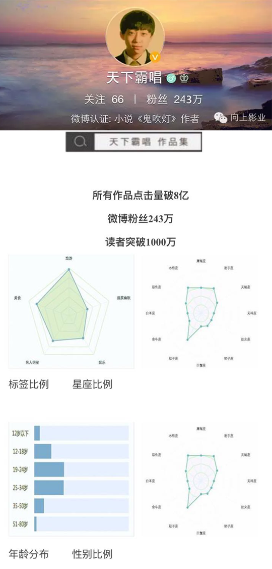 天下霸唱,向上影业CCO(首席内容官)。天下霸唱将对向上影业陆续启动的超级网剧IP 《鬼吹灯之牧野诡事》、《凶冥十杀阵》、《我的邻居是妖怪》等进行内容上的把控,制作出内容精良的佳作。其中,由黄晓明和天下霸唱联合监制、向上影业与爱奇艺联合出品的《鬼吹灯之牧野诡事》尤受瞩目,这部剧投资超过一亿二千万,新圣堂编剧,金牌班底全力打造全新“盗二代”之旅。 2016年网络大电影《鬼吹灯之牧野诡事》番外篇、 《守魂符》、《崔老道追妖》 、《灵异游戏》将悉数启动。